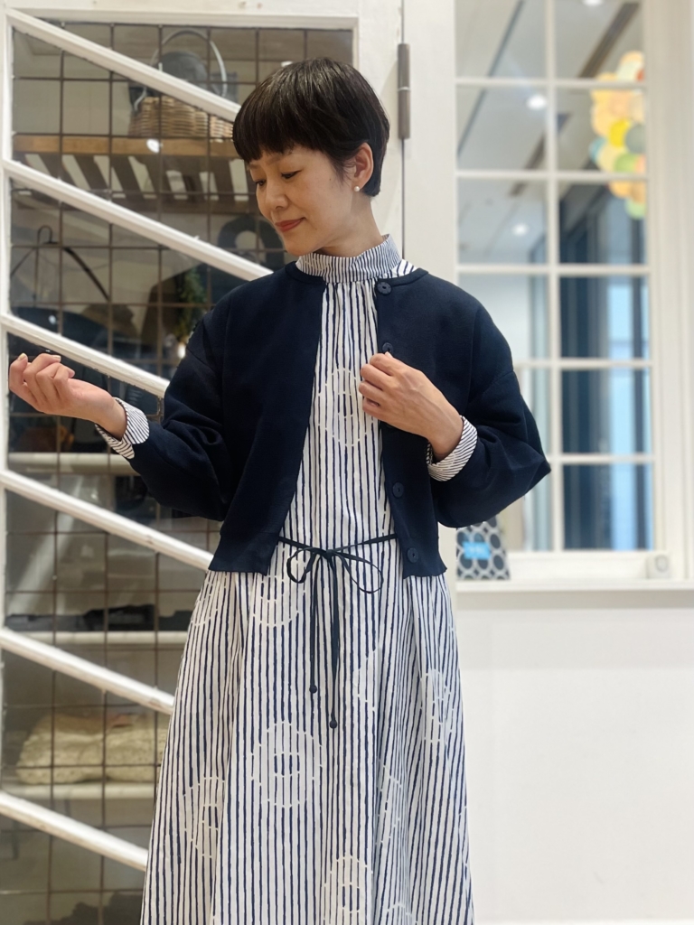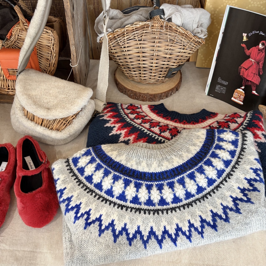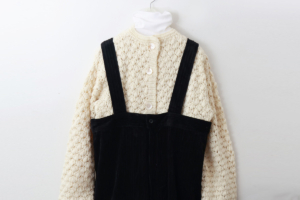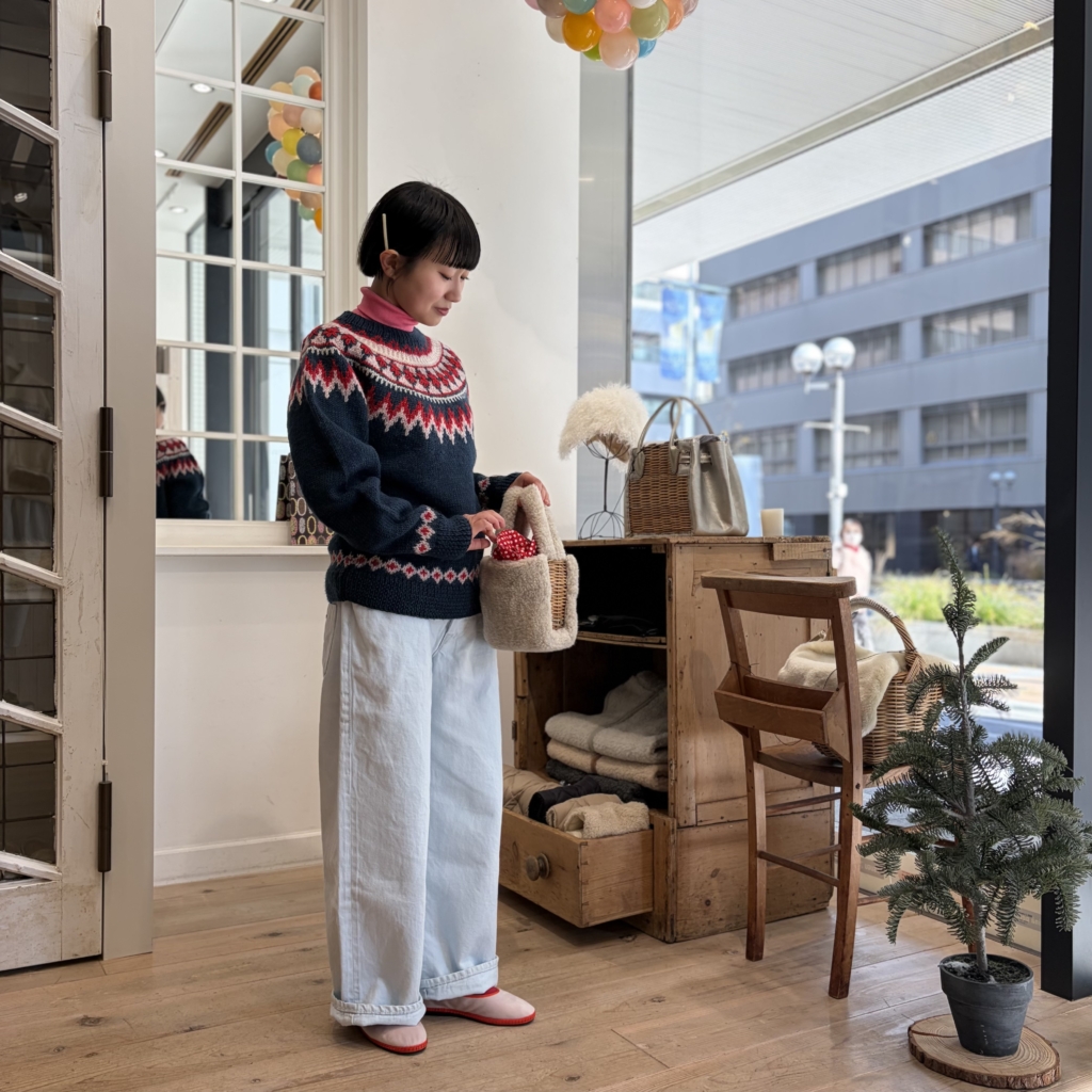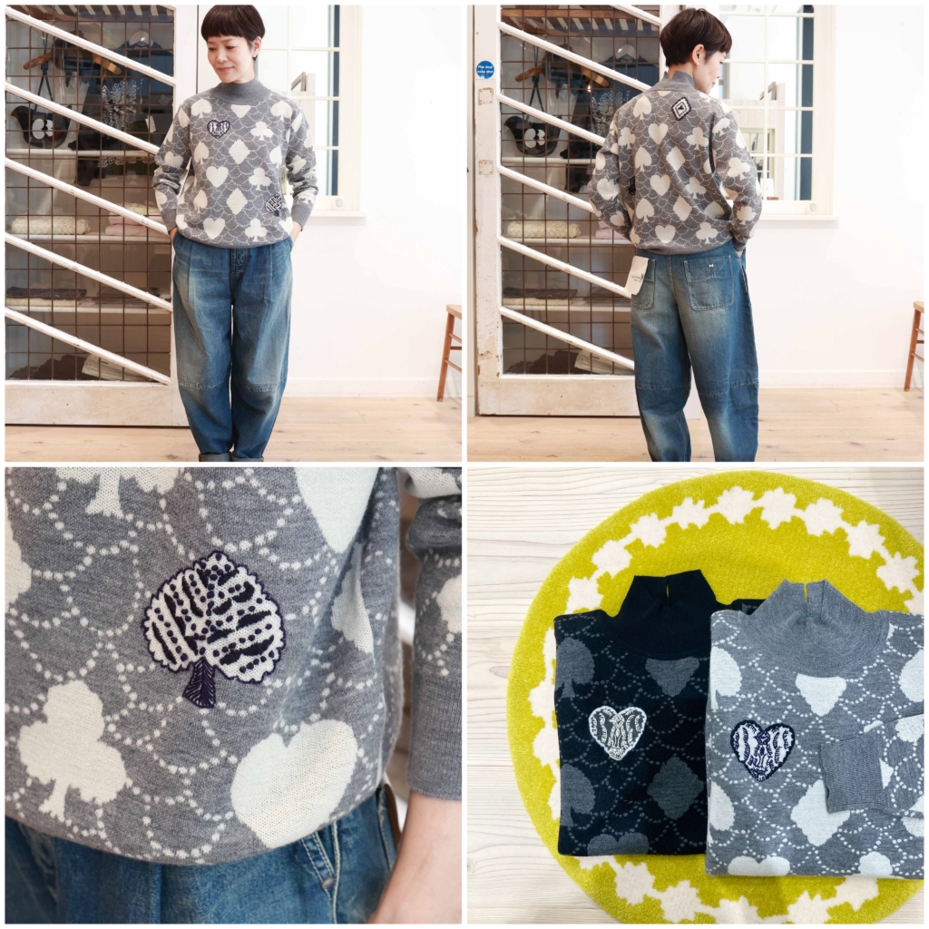 中に着用したトランプのモチーフに森の情景を映した“forest card(フォレスト カード)”のプルオーバーは、ジャカード編みのニットに、縫い留めた刺繍のモチーフが4つ浮かんでいます。