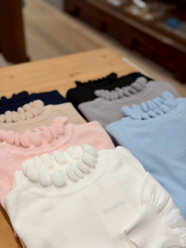 人気のあったアーカイブニットを元に糸やカラーを変え、別注でお作りいただきました。 首元のフリルと袖口のポワンとしたパフがポイント。少しシャリ感があるので、さらりとお召しいただきやすい素材感です。