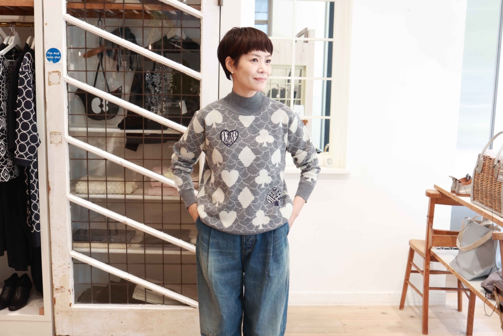 中に着用したトランプのモチーフに森の情景を映した“forest card(フォレスト カード)”のプルオーバーは、ジャカード編みのニットに、縫い留めた刺繍のモチーフが4つ浮かんでいます。