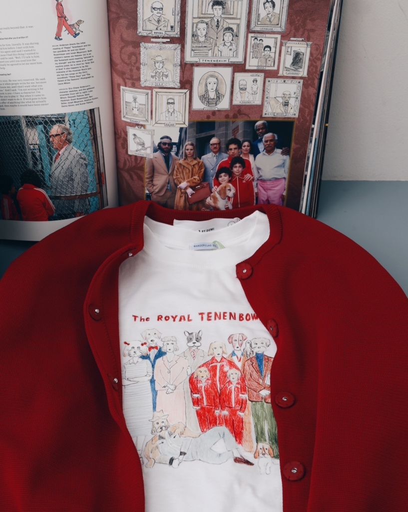先日そのTシャツが入荷し、ただいま3 ET DEMI神戸店と当店のオンラインショップで販売しています。さっそく赤いジャージや赤いカーディガンと合わせて着ています。