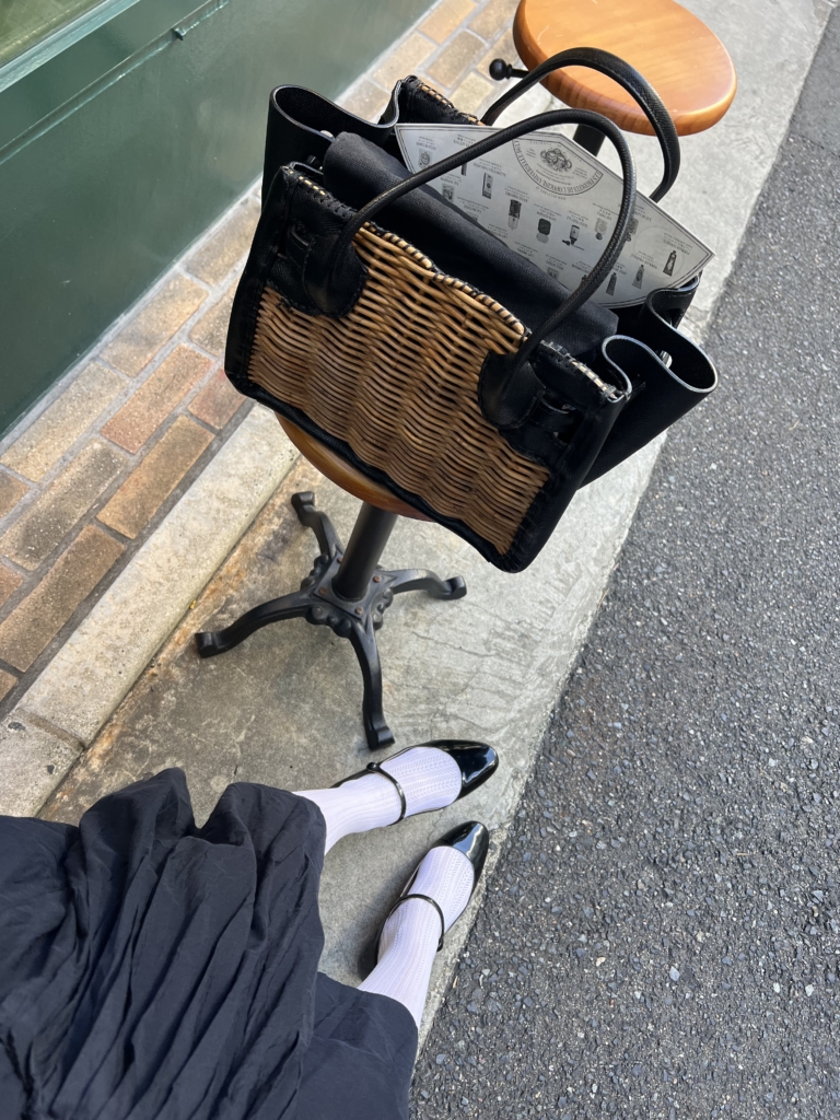 ヘアピン・ソックス(ルールロジェット)バッグ(eb.a.gos)コットンブローチ・イヤリング( プティローブノアー)ワンピース(ミナ ペルホネン)リブタートルネックカットソー(ホームスパン) 付け襟(BUNON)エナメルの靴はmiu miu。