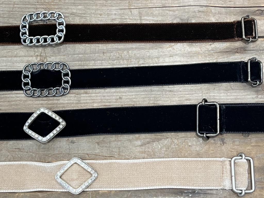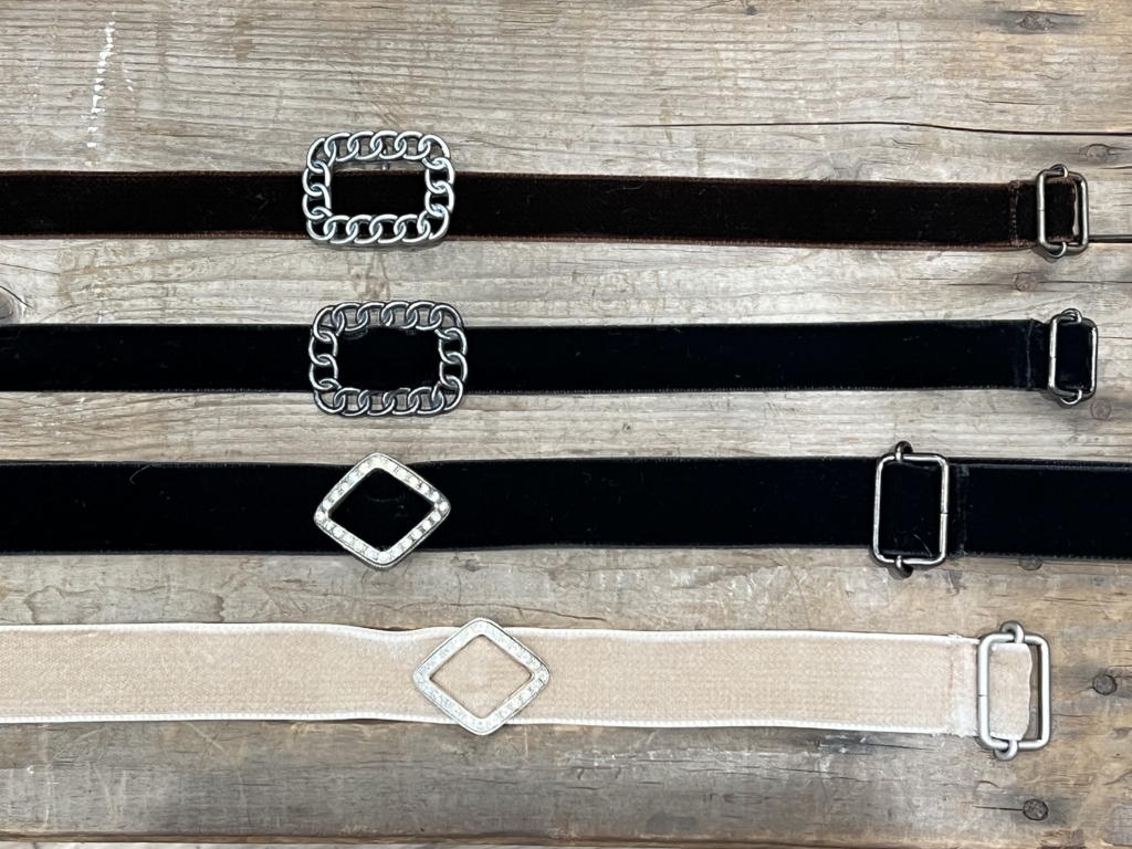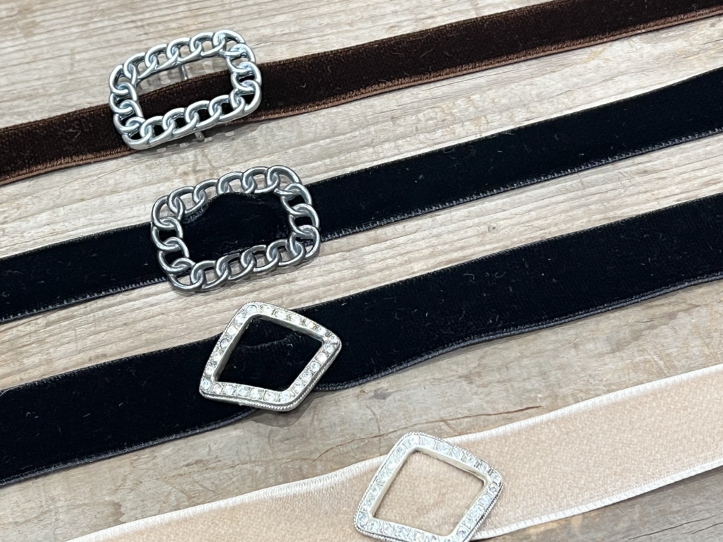 ベルベットのリボンのお色は、ブラウン・ブラック・ベージュの3色。お好きなバックルとリボンのお色をお選び頂けます。