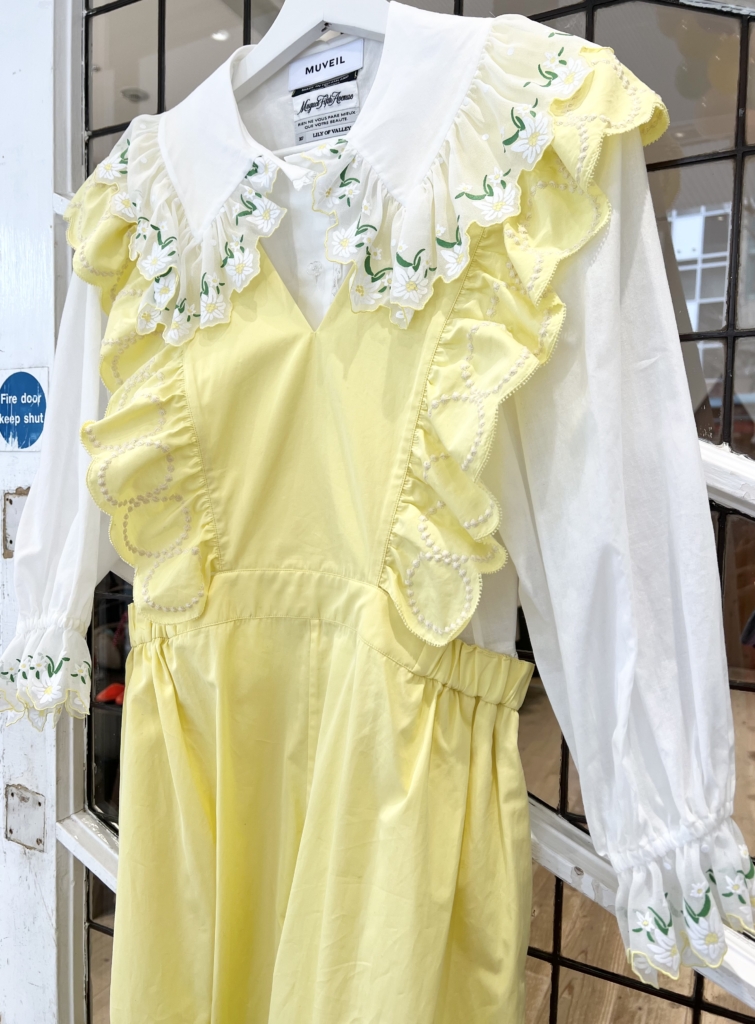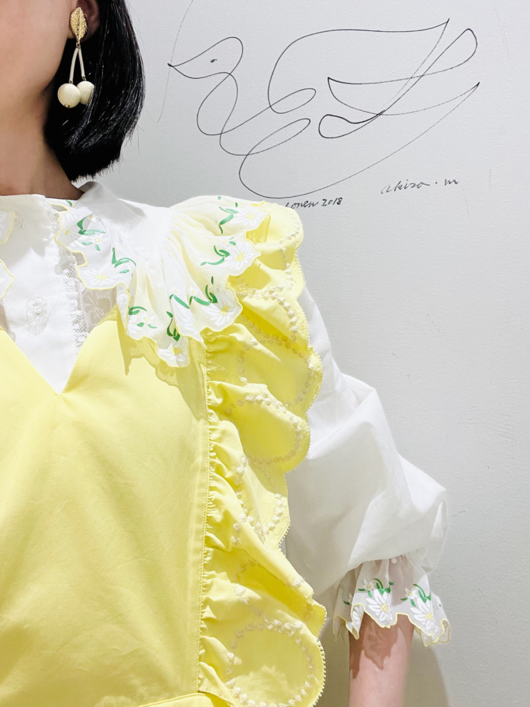先日入荷したばかりのミュベールの新作のブラウス、とても素敵です。黄色のカーディガンとの相性もバッチリ💛