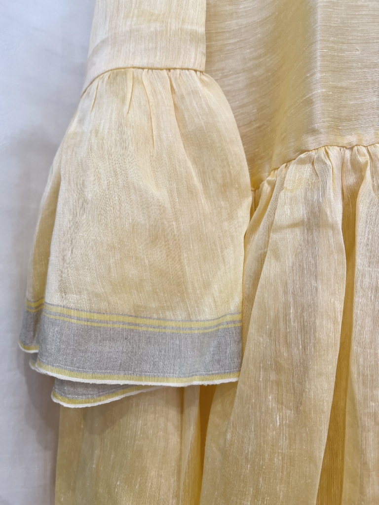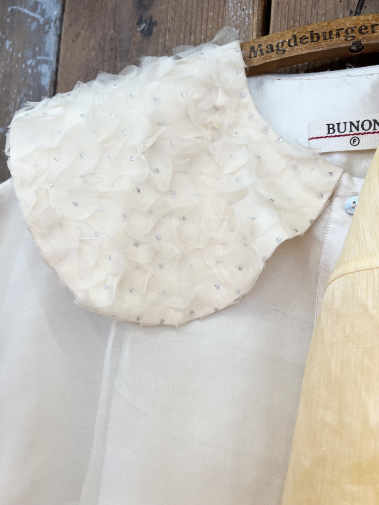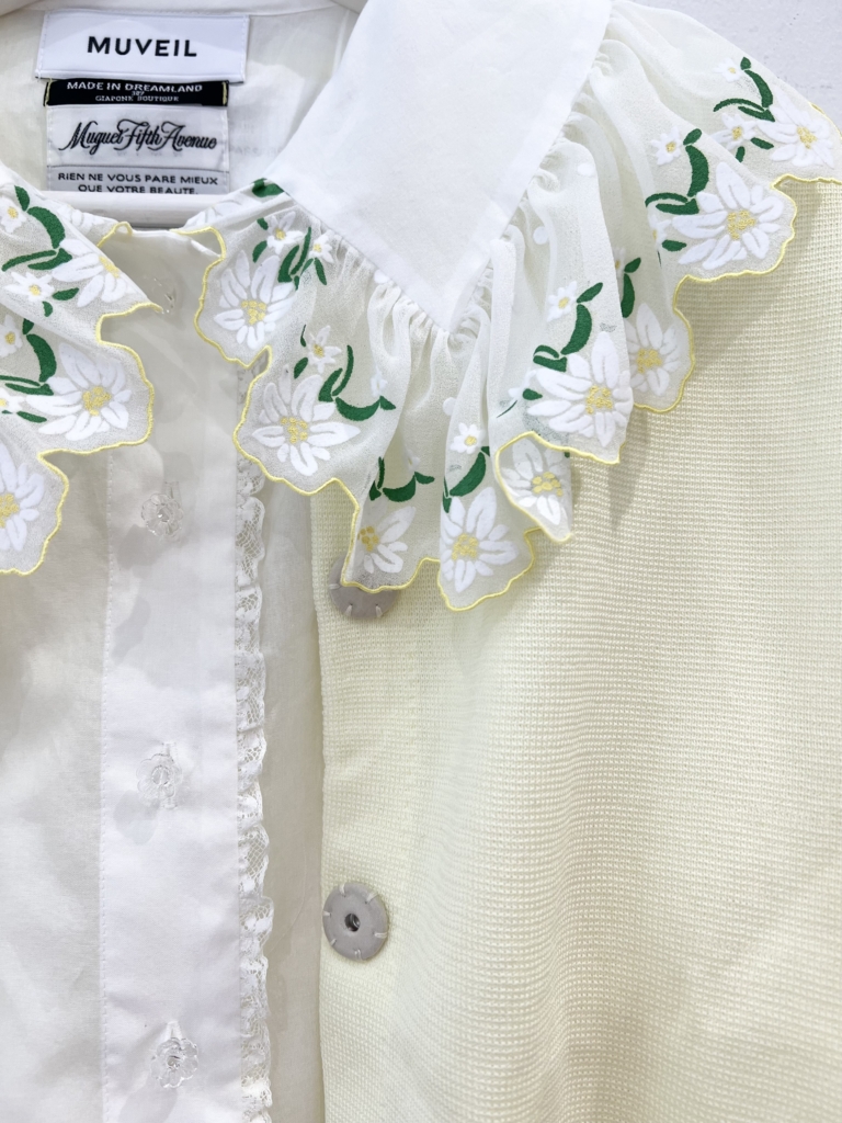 エーデルワイスのプリント襟にキュン💛透明のお花のボタンが爽やかです。襟は透け感のあるジョーゼット素材にフロッキー加工を施しています。細番手の綿ローンを使用し肌に心地よく馴染む、季節を問わず着ていただける上質なファブリック。薄くて軽やかな素材のブラウスです。