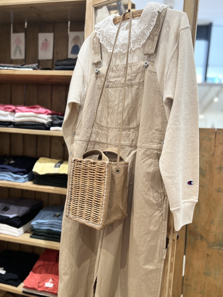 チャンピオンのトレーナーは今の時期にぴったり。パーカータイプもあります。4色展開です。中に合わせているレースのカットソーはドットアンドストライプス。立ち襟タイプもあって、どちらも再販してもすぐに完売する人気のアイテムです。アモッサのカーディガンとのコーディネートで、各店舗で好評いただいています。
