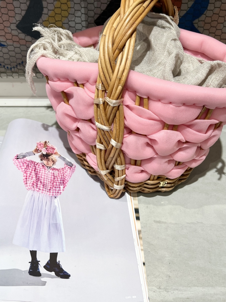 かごに付いている、ミュベールのピンクのお洋服を着たグランマチャームも神戸店と芦屋店でお取り扱いしています。