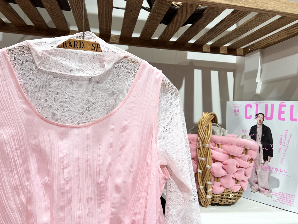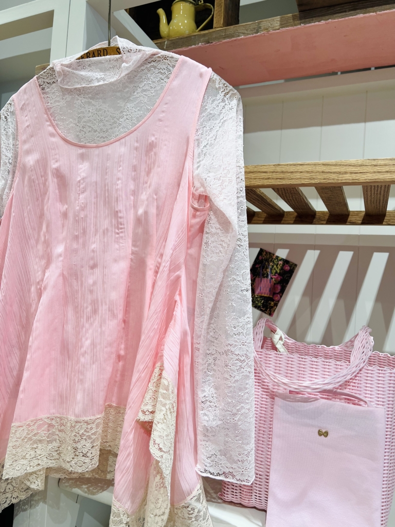ルールロジェットの春らしい桜色のコーディネート。レースのカットソーは、こちらのライトピンクの他に、ホワイトとミントグリーンとブラックの4色展開。
